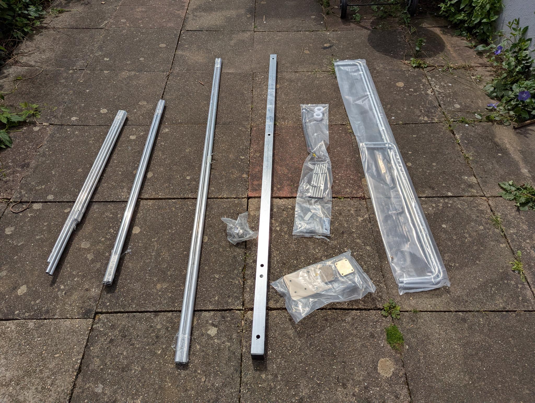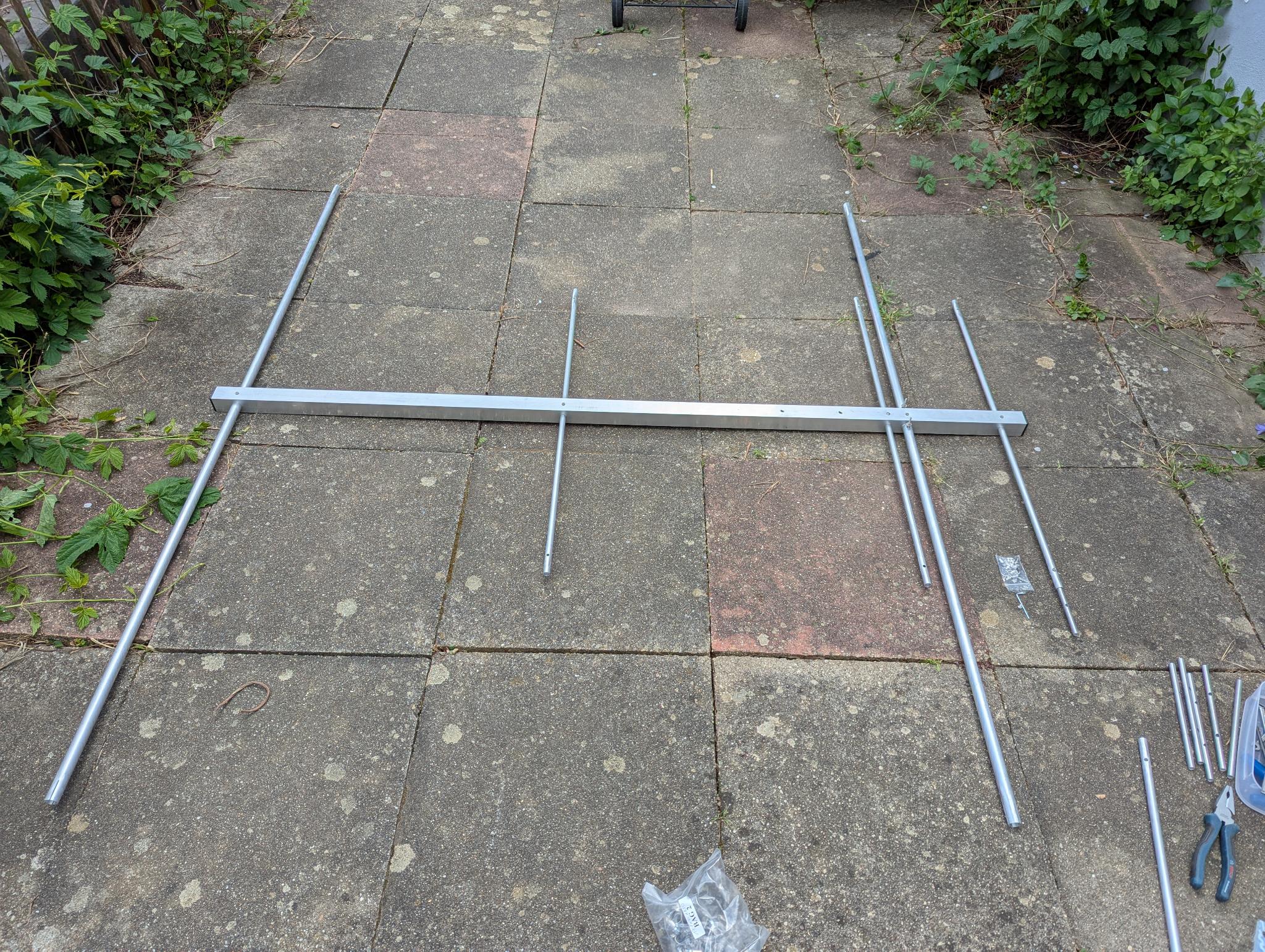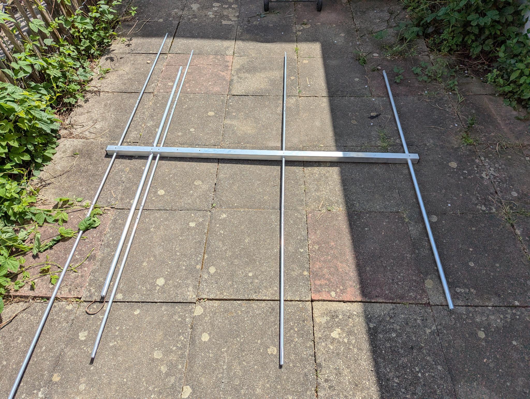 Now comes the tricky part. There are four 13mm tubes of the same length with holes on the one side and slots on the other. They need to be slid over the previously inserted short inner tubes and mounted with the remaining screw/threaded insert combos. This time it was very tricky as the holes need to be aligned and are not very cleanly drilled. Those four extension tubes need to be mounted to the two inner 6m elements. There are two remaining 13mm tubes that are longer than the previous four and need to be mounted to the 6m director (most left tube on the next image).