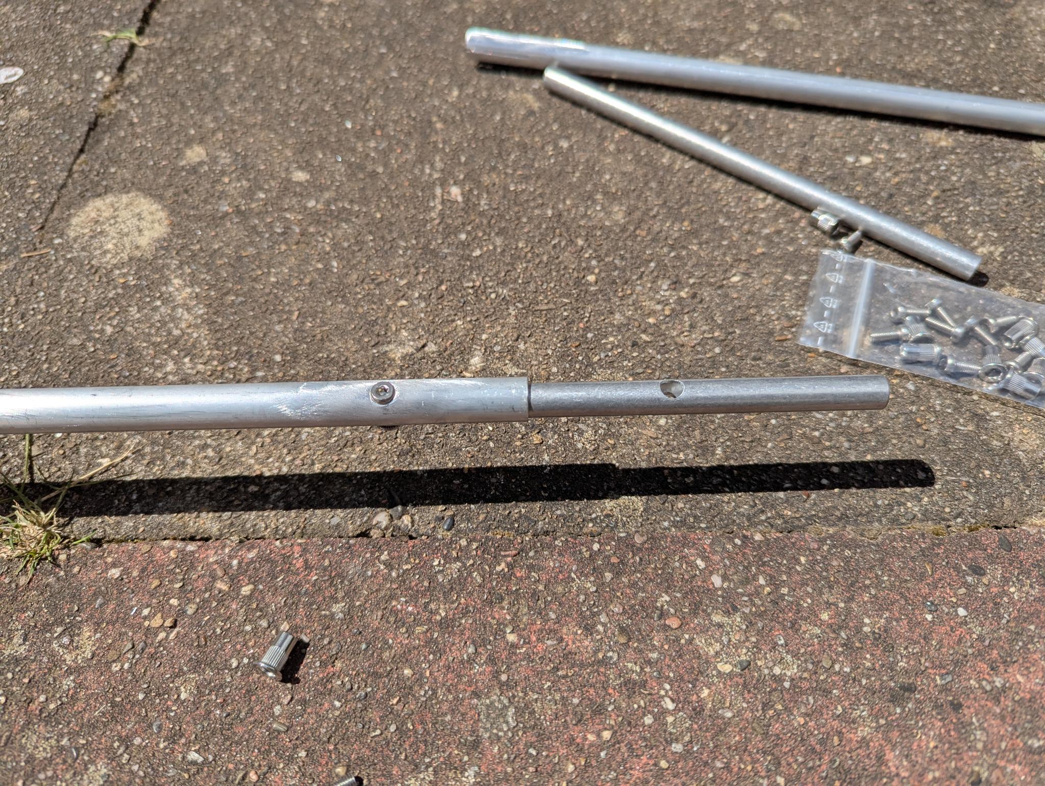 All three 13mm tubes for the 6m band need to be extended. For this, the six short tubes of same same length with holes at each end are inserted into the tubes and fixed with a combination of a screw and a threaded insert (bottom left on the floor in the next image). The threaded insert belongs into the smaller hole, the screw into the bigger. This way the screw head slips though the hole of the outer tube and sits tight on the inner tube.
