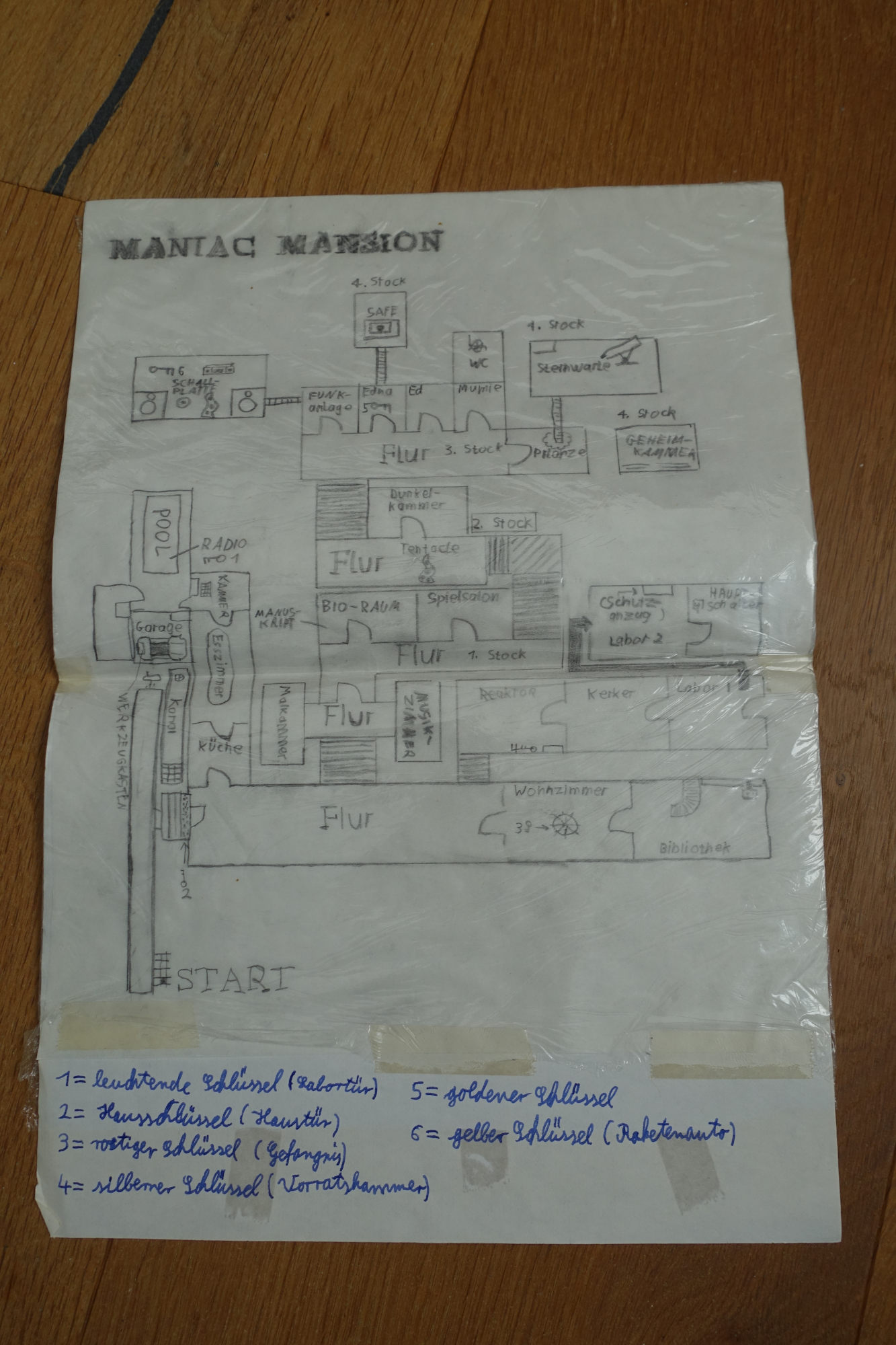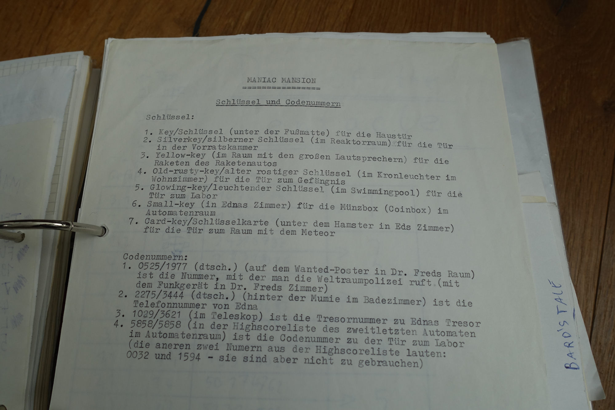 I also took notes on its predecessor, Maniac Mansion, and even made a map of the house. The following picture shows typewritten notes listing the locations of the keys to be found and the code combinations to be determined: