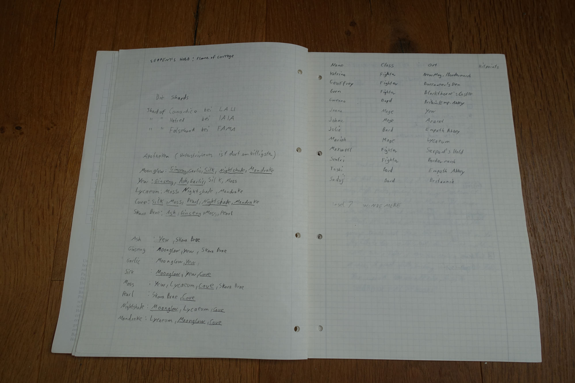 The left page lists shards together with something I don’t understand anymore, pharmacies and what you can buy there (underlined are the items that are the cheapest at this place). There’s also a table that shows the magic ingredients and in which city they are purchasable. The right page shows NPCs that can be added to the party with their classes and where to find them: