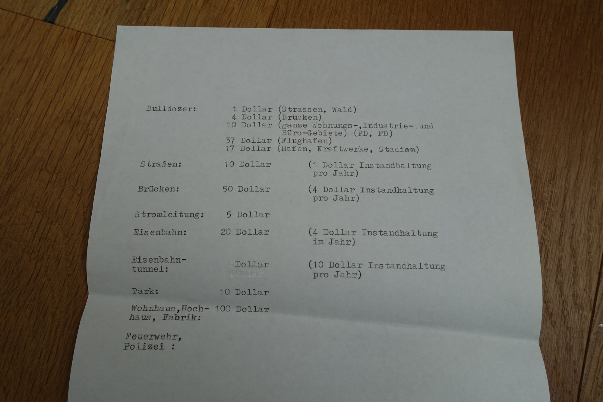 Finally, a list of what it costs in Sim City to build or demolish roads, railway lines, power cables, etc: