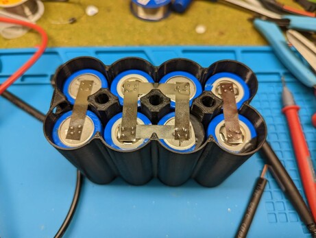 I also needed do order a spot welder kit for this. After I received the spot welder kit, I assembled it and built the smaller battery pack (4s2p) of the two with 14,8V and a capacity of 6200mAh. Worked fine but I had to use a 100Ah battery as power source to make it actually weld.