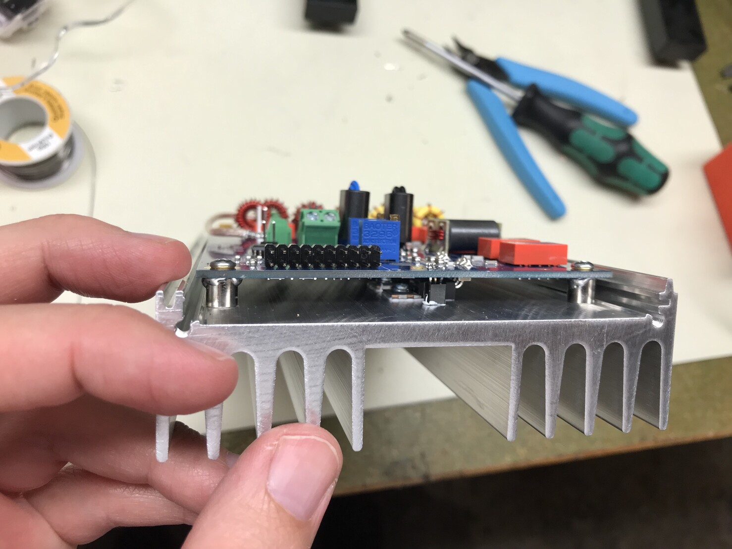 After the PCB has been mounted on the heat sink, the remaining tasks of the assembly is some internal wiring:
