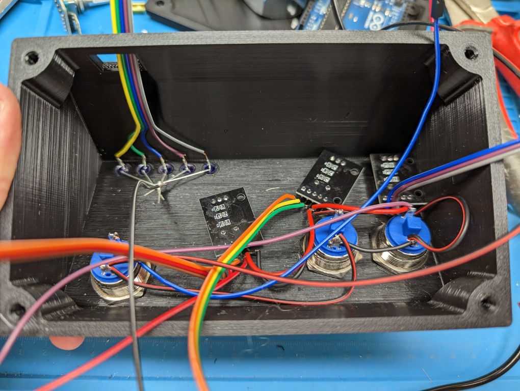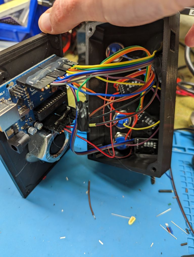 - All connectors going into the arduino. I’ve populated all pins with cut off plugs so that they hold each other better and that the hot glue stays in place while glueing