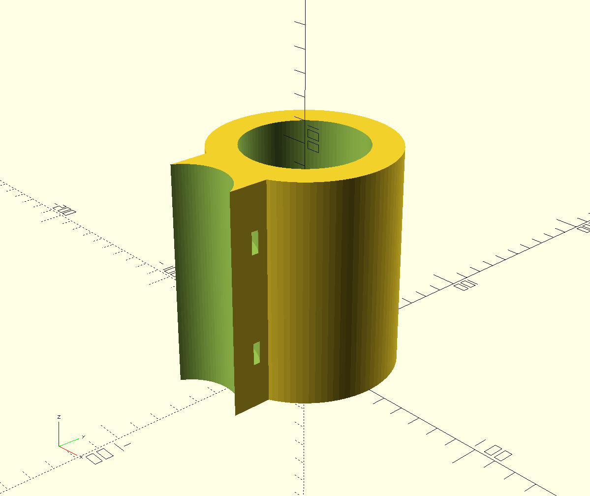 The project linked above was well suited for initial experiments, so I have now implemented it in OpenSCAD. The idea was to parameterize the object in such a way that you only have to adjust a few variables to be able to print it for other pipe diameters, for example. So far I have only succeeded to a certain extent.