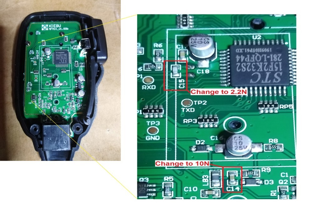 When using the original G90 microphone, your voice might be too bassy. To solve this problem, open the mic and replace the cpacitor C15 with a 10 nanofarad SMD capacitor and C14 with 2,2 nanofarad (both size 0603). source