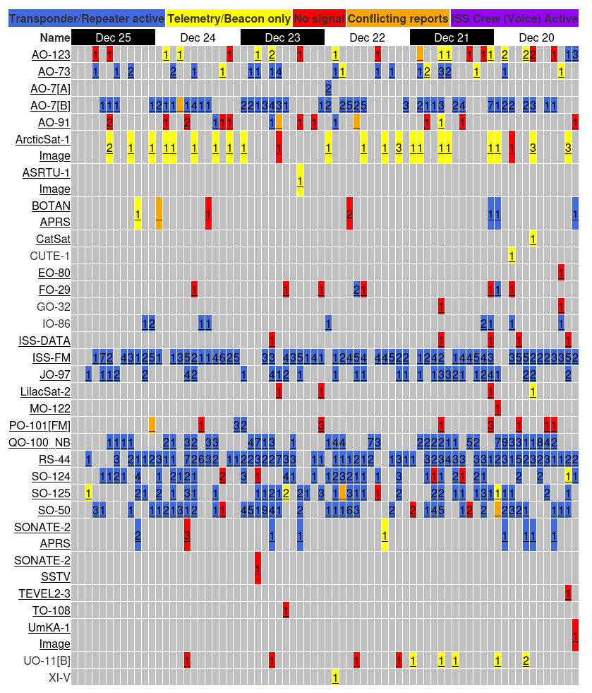 I monitor this page for new satellites, changes in operation modes or to see when to expect traffic on specific sats. The following screenshot shows the status from the time of this post’s writing: