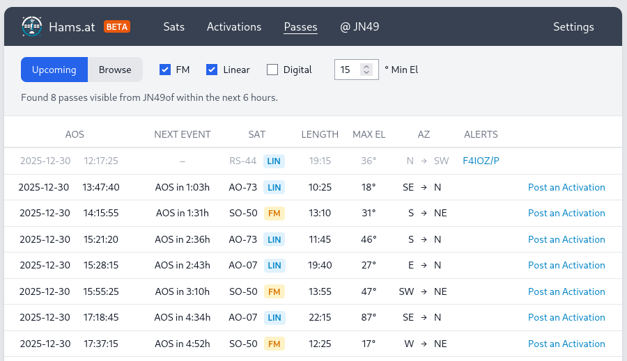 Hams.at states in its about page that “This site is not intended to be a replacement for satellite pass prediction software. For now, it’s just a tool to promote operating activity”. Well … I use it for satellite pass predictions and it is doing an excellent job at this. It’s one of my most important pinned tabs in my browser which I use to plan my (ham radio) day. After you have entered your locator, it provides you with a filtered list of upcoming satellite passes including all necessary information like AOS (aquisition of signal / start of the pass), length of pass, maximum elevation, direction of pass and if another operator announced that he/she will be QRV during a particular pass on a satellite.