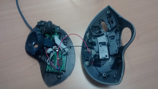Since the USB port should give us 500 mAh and the trackball shouldn’t consume more than 150 mAh, the wire can consume up to 350 mAh. Knowing the voltage of 5 V and the desired power consumption, it is easy to calculate the needed resistor:
