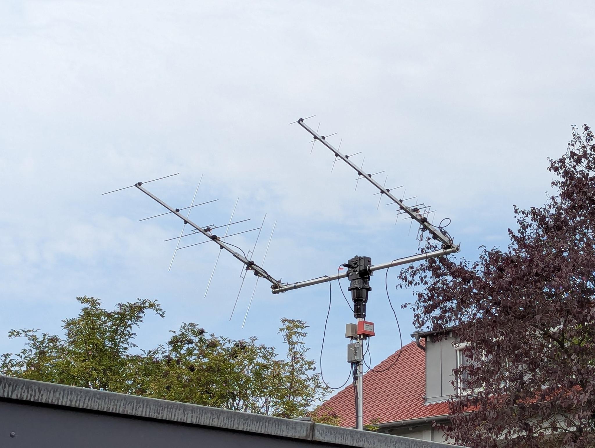 I replaced the eggbeaters with a cross RHCP 2m/70cm satellite antenna kit from antennas-amplifiers.com. These RHCP circularly-polarized antennas provide significant gain compared to omnidirectional eggbeaters and allows working satellites also during low-elevation passes. To improve the received signal and to compensate cable losses, I installed mast-head preamps for both 2m and 70cm.