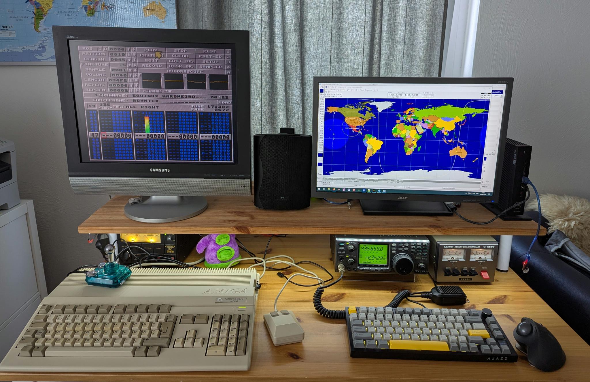 SatPC32 is the central control element on the shack PC. It handles TLE-based tracking, computes doppler shifts, and drives both the G-5500 rotor (via the RTC-200) and the IC-910H radio (via CAT). SatPC32’s ability to split RX/TX control and apply doppler compensation magic to the radio VFOs is what makes linear-transponder contacts quite easy. The IC-910H’s CAT integration lets SatPC32 set RX and TX frequencies in real time for each pass, so the radio follows the satellite precisely. It’s also great that I can change the frequency via the radio’s VFO knob while SatPC32 takes care of doppler shift correction for both, the receive band and the transmit band.