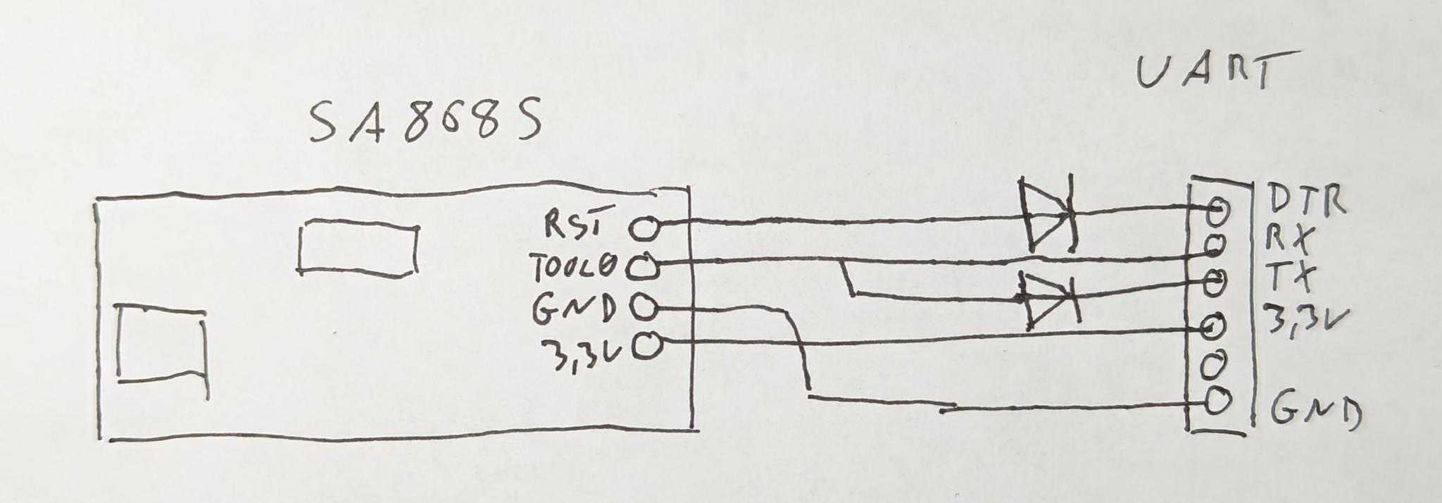 We now have the software and firmware in place but we need to build a small programming adapter. I’ve done this with a UART to USB converter, two 1N5819 diodes, some wire and a small PCB. Here’s a diagram showing how it is connected:
