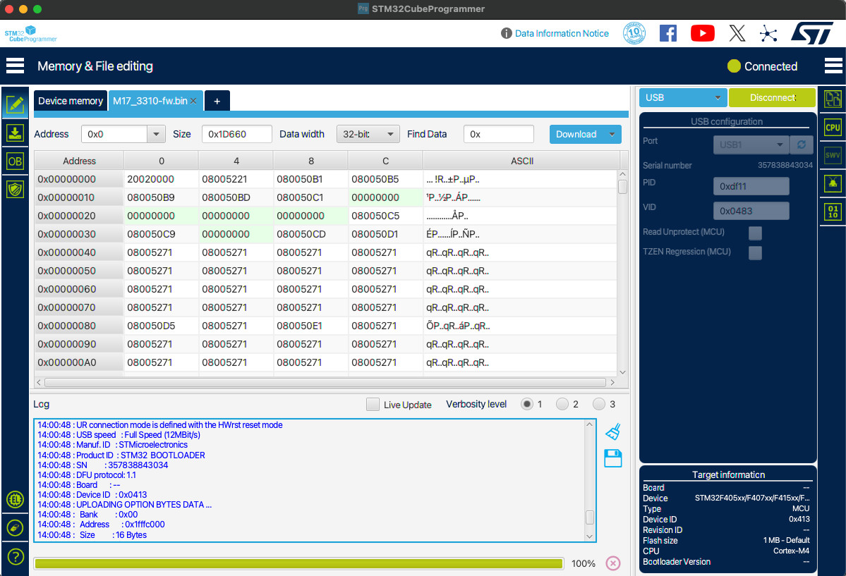 To flash the microcontroller with the firmware, download and install STM32CubeProgrammer. It is available here for Mac/Lin/Win.