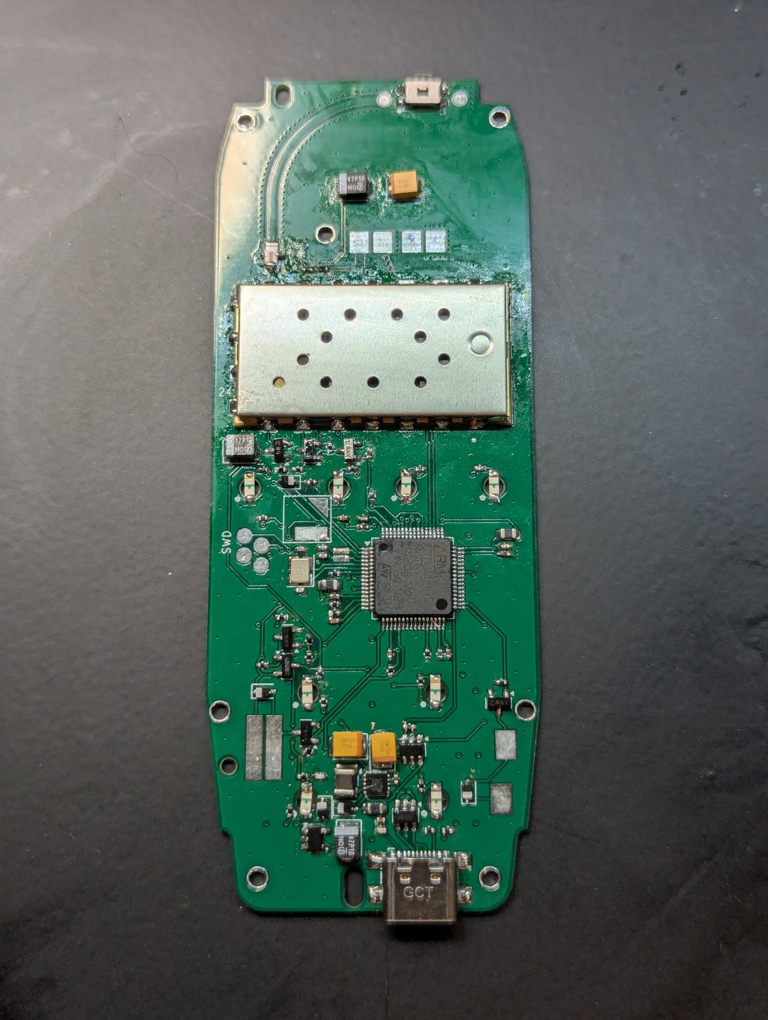 When I got back home, I re-soldered everything several times, but each time without success. The ST32 programmer did not recognize the board. Then I reached the point where I didn’t care anymore. So I practically drowned the board in flux and first soldered all the components with a soldering iron at 450C. Then I re-soldered U5 and Y1 with 450C hot air for quite a long time. This is what the board looked like after this torture (only half way cleaned):