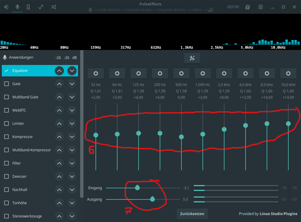 Posted on 2023-11-05 by DK1MIAfter migrating from Windows to Linux and with this from SDR Console to the AMSAT-DL QO-100 Linux Transceiver, I had the issue that my transmitted audio was a bit weak in the treble. The solution to this was to install and configure the software equalizer PulseEffects to modify my microphone audio before it gets fed into the SDR application.