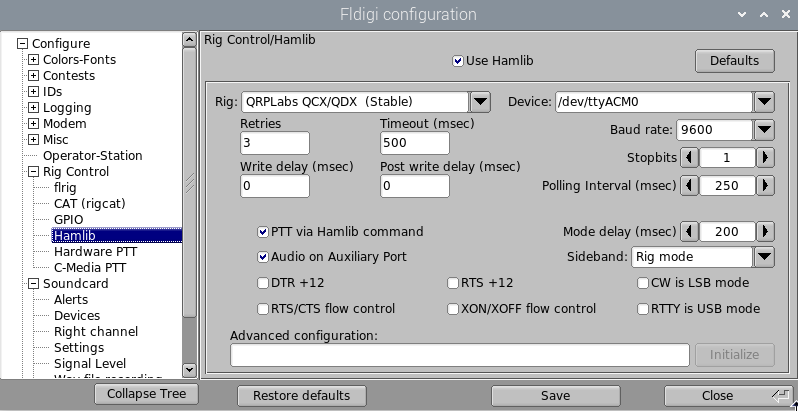 Afterwards, click on Rig Control -> Hamlib and configure it as follows: