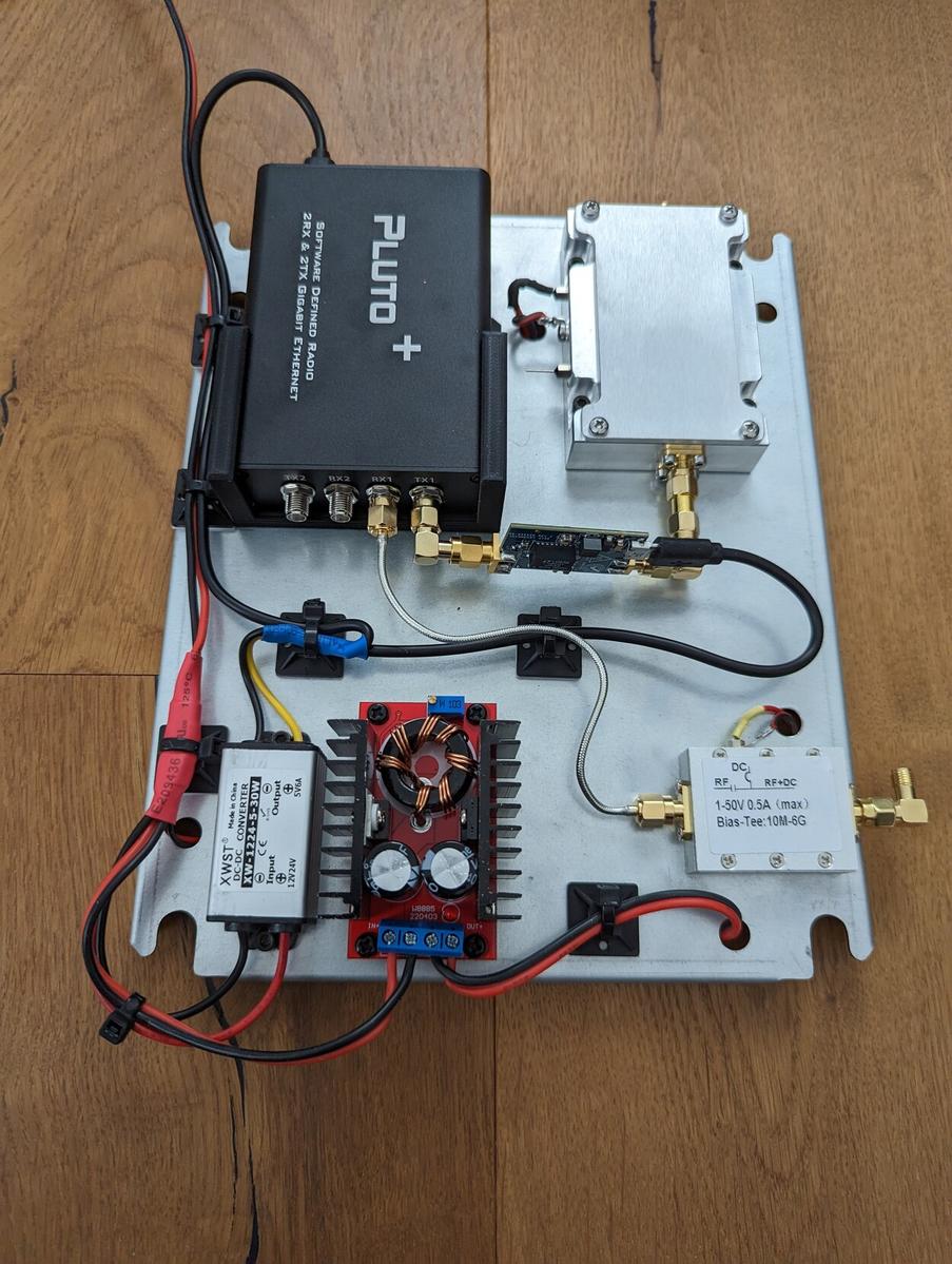 After searching the web, I’ve found a setup based on the Pluto+ SDR transceiver which I’ve then built. It consists of the following components: