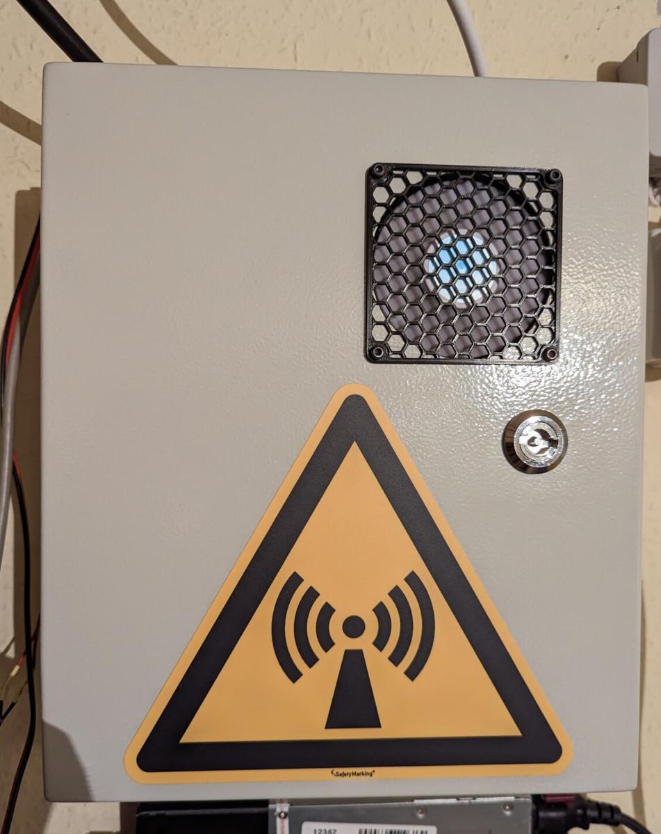 The 20W PA can handle up to 70C but I’d rather like to have it cooled down. First test also have shown that the Pluto, which is sitting next to the PA, gets pretty warm from the radiated heat of the power amp. The solution was to cut a 80mm hole into the enclosure’s door right in front of the PA and mount a fan on the inside. The enclosure is mounted indoors so I did not have to take care of waterproofing. The air is blown from the front directly onto the PA and then flows out on the top side of the enclosure wich is open.
