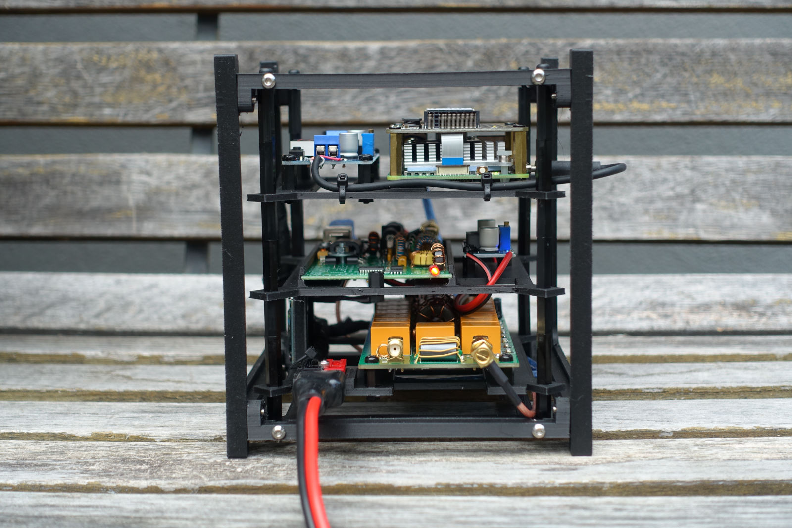 The finished QDX was then inserted into its module carrier. In addition to the QDX, a buck converter was installed on the carrier, which regulates the 13.8V for the QDX down to 9V.