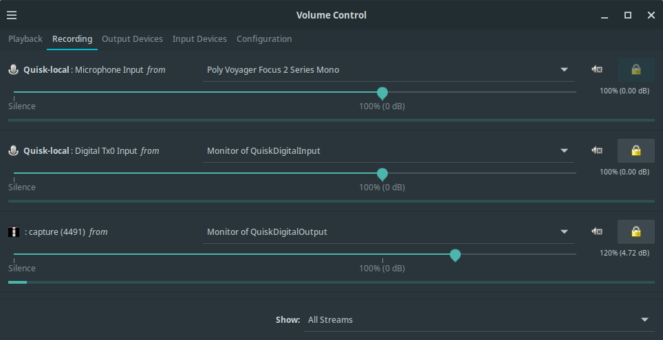 Now start the Pulse Audio Volume Control application with the command pavucontrol. You might need to install it first from the package repository.