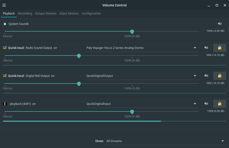 Click on the tab “Playback”. You will notice that there is no such line with the Fldigi icon visible. This is because it is only there when you transmit from inside Fldigi. Pick a clear frequency and e.g. send a longer CQ message in Olivia. As soon as Fldigi switches to TX, a new line with the Fldigi icon and the text “playback (some number)” will be shown in pavucontrol. Select “QuiskDigitalInput” in the drop down box next to it: