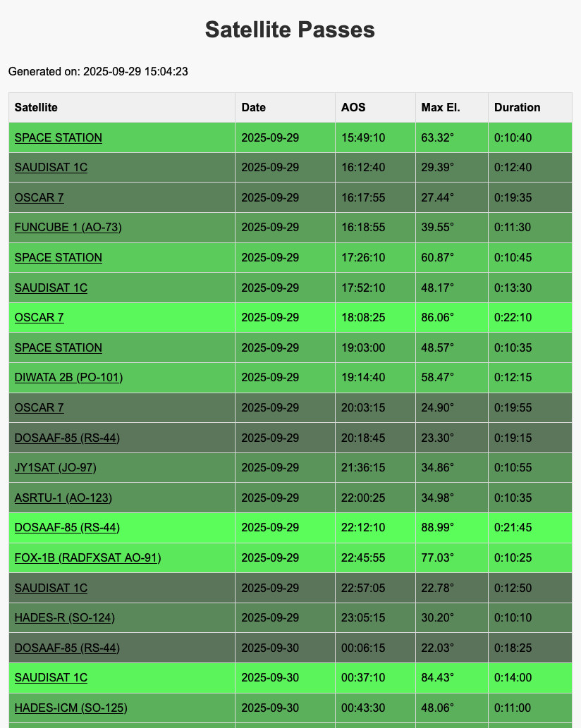 Posted on 2025-09-18 by DK1MIsatpasses is a simple Python script that pulls satellite information on your favorite SATs from N2YO.com via their API to build an even simpler static HTML page listing all satellite passes over a user definable location for the next n days. Each row of the generated table has a different shade of green depending on the max elevation of the corresponding pass. A higher maximum elevation results in a brighter green.