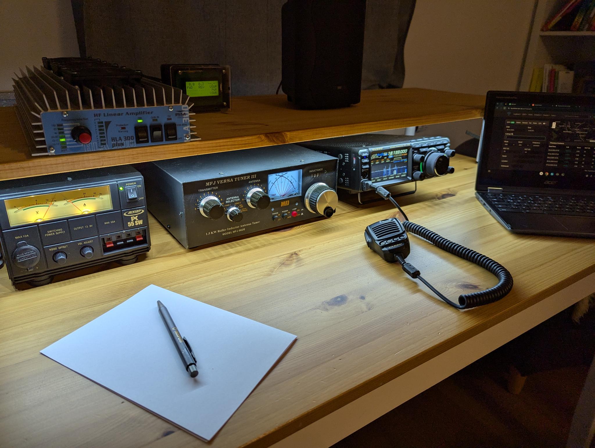 I now finally have a comfortable shack in a tempered, dry and clean environment with direct coax cabling for quite a low budget: The Ecoflex 10 was already in use before and was only routed differently, the table was available and could be dispensed with at the previous location and the table top only cost me €25. Actually, I already have everything I need in the shack, now I’ll follow things that I don’t need but might want – such as a shack sign ;)