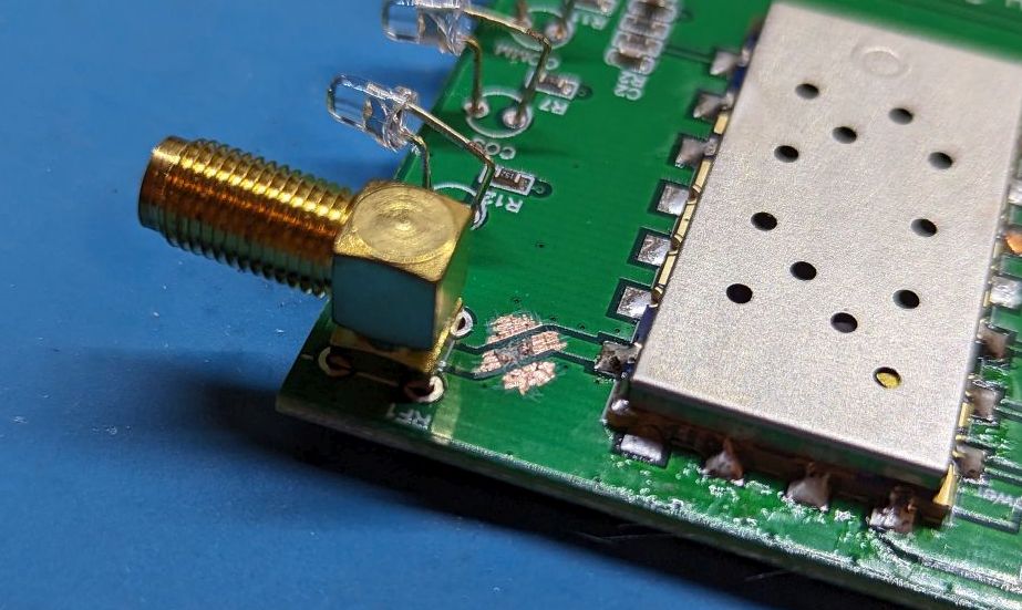 Everything was now prepared for soldering the LPF to the PCB. Please note that the component must be placed lengthwise to the disconnected trace and the side pads of the LPF must be soldered to GND: