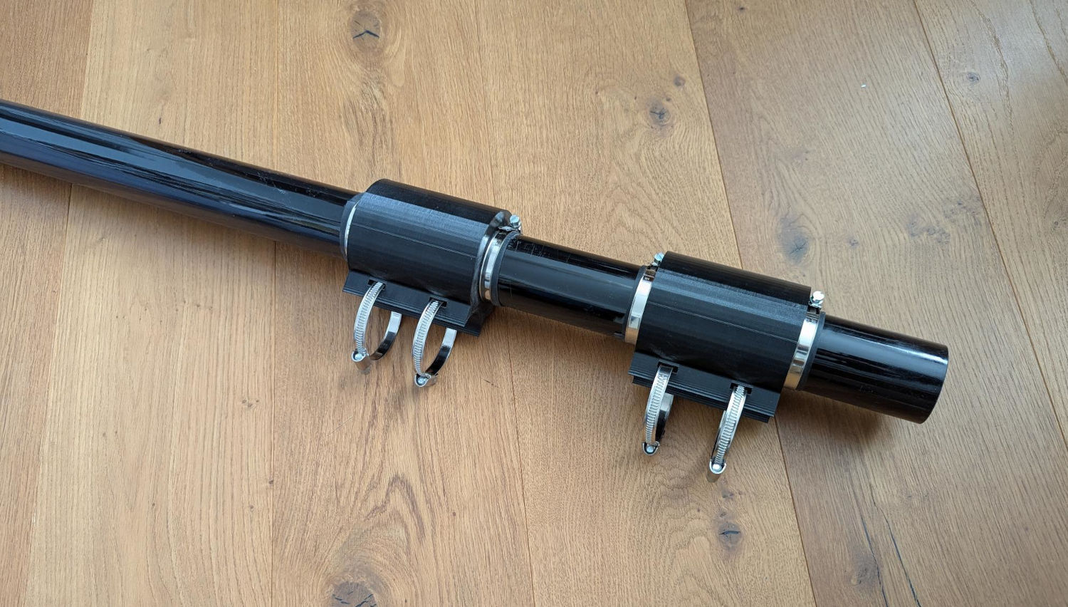 I’ve printed two of these adapters and slided them over the lower tube of the mast which has an outer diameter of 55mm. Then I used a total of four stainless steel hose clamps per adapter: two to attach the adapter to the steel mast and two more to prevent it from moving up or down. To protect the Spiderbeam mast, I’ve cut stripes from a bicycle tube and placed them under the hose clamps: