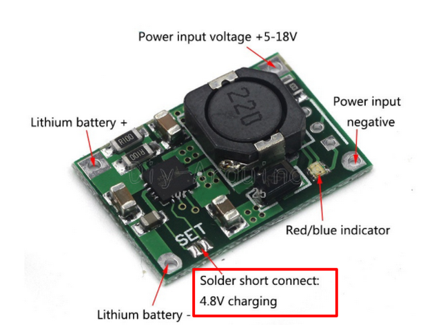 - bridge the pad labled “set” on the TP5100 (not shown in the picture)