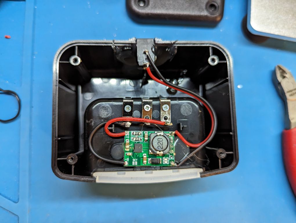 - solder a 2-wire cable to the DC jack and hot-glue it into the back of the charger. I’ve used painter’s tape to hold it in place while the glue was curing